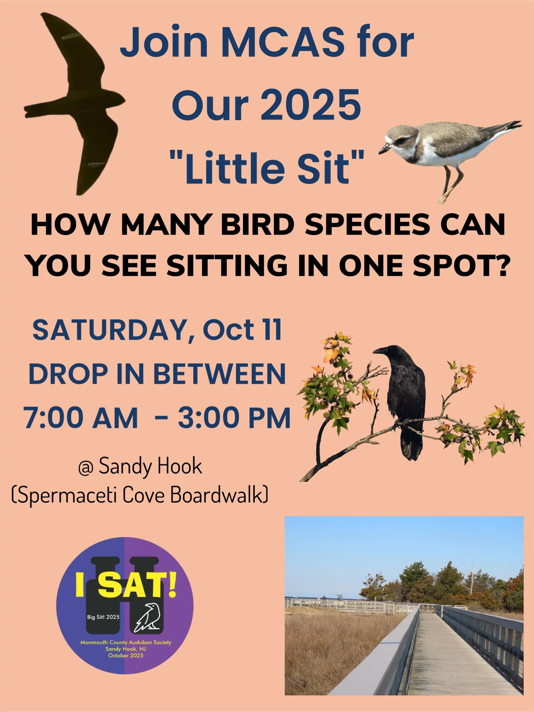 We will hike the Fisherman’s Trail to ocean for nesting Osprey, Piping Plover, American Oystercatcher and terns. The trip is open to both members and non-members of the Monmouth County Audubon Society, and participation is free. Advance registration is required.