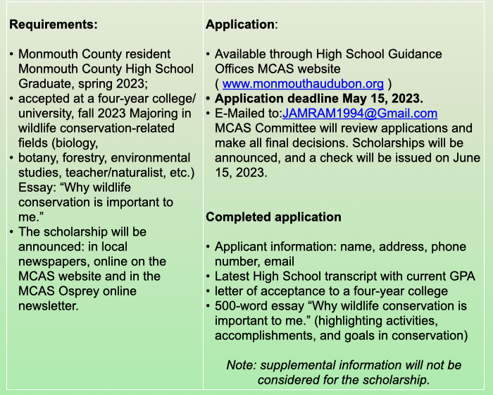 The one-page application requires: name and contact information; high school transcript with current GPA; a letter of acceptance from a four-year college or university, and a 500-word essay, “Why wildlife conservation is important to me.” Applicants must be residents of Monmouth County.
